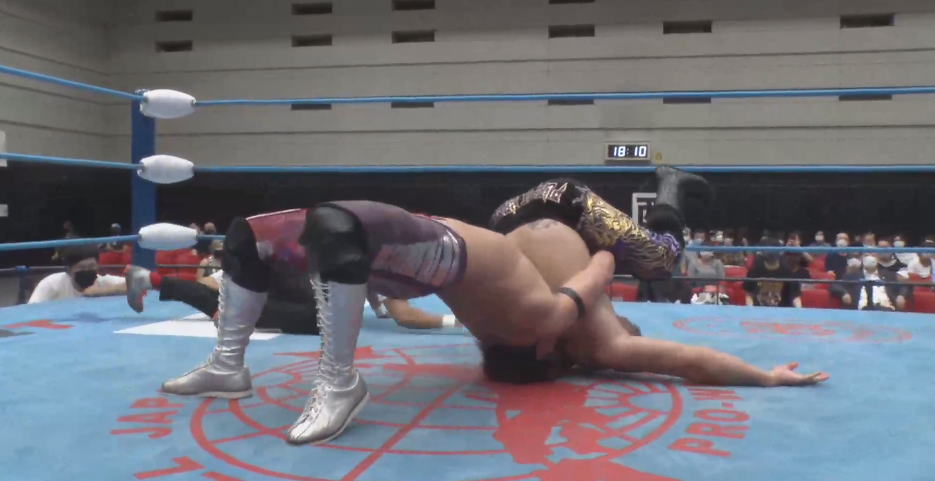 いや、もちろん同階級同士でも足攻めは効果的ですし戦略的にはわかるのですが「無差別級で行く!」と宣言した岩本煌史がヘビーとの戦いを始めた最初の試合でここからずっと足攻めで組み立てるとジュニア感が強くないか?と。