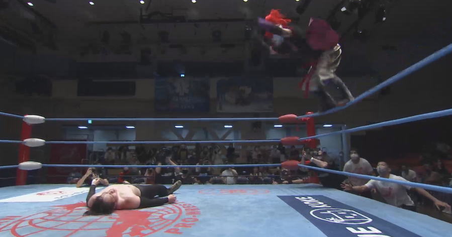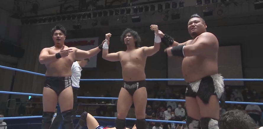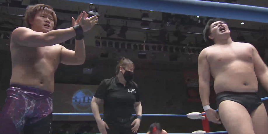 こんな引き出しもあるんだぞというジェイク・リーへの圧力にもなるであろう勝ち方ですが、確か以前この技で大森に勝利した後に三冠戦で負けたような・・・(笑)