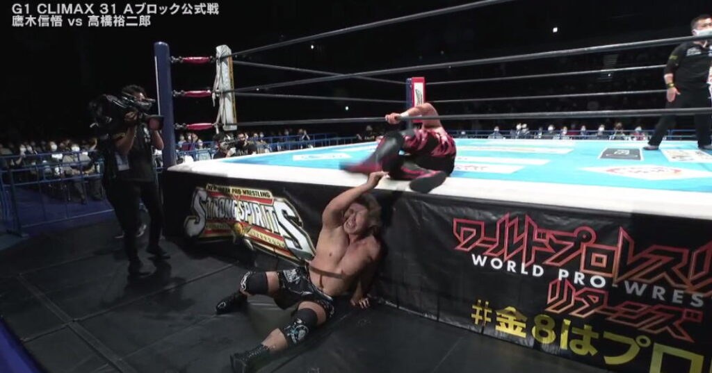 まずAブロック、高橋裕二郎は鷹木信悟に対して明らかに両者リングアウトでの引き分けを狙っていました。