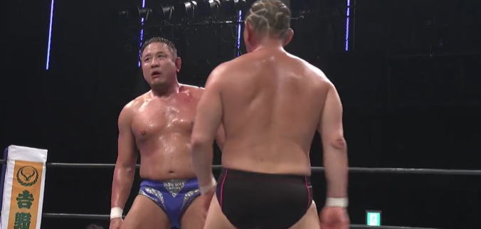 試合開始からエルボーと張り手だけの「しばきあい」を見せた鈴木みのると永田裕志