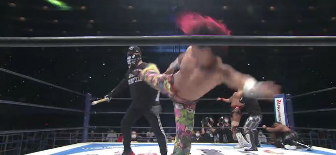 外道と高橋裕二郎がまだ登場していなかったので、その時にBUSHIやSANADAが動くのかと思いましたが(鷹木信悟はタイトル戦後なのでいなくても仕方ない)結果的にこの試合で内藤哲也を助けに来たのは高橋ヒロムだけ。