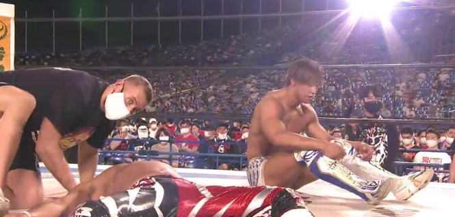 これを待っていたと言わんばかりに動いたタイチとザックの合体技ザックメフィストを食らうとそのままなんと一気の3カウント負け。