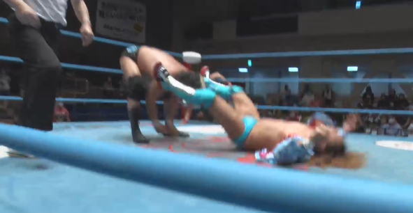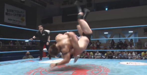 それを勢いで崩そうと場外で攻め込んでいく田村でしたが、一瞬のスキをついた一本背負い→ネックスクリューと場外で大技を連発してチャレンジャーの心を折る...いやチャレンジャーの気持ちを確かめるような厳しい攻撃を見せました。