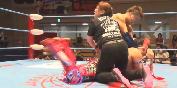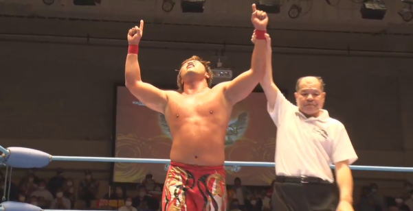 この試合は昨年秋の王道トーナメントを優勝した秋男のジェイク・リーが非情な腕攻めを見せて最後は変形の腕固めでレフェリーストップ勝ち。