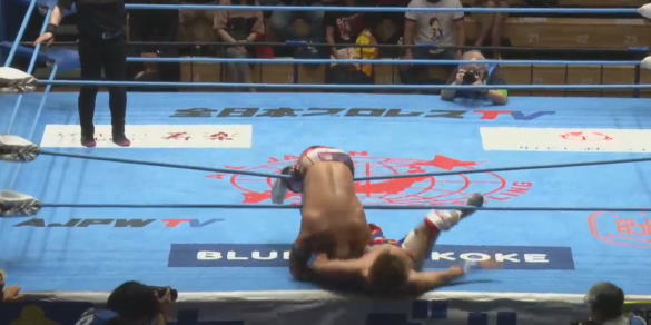 ブレーンバスター→そのまま回転して起き上がりネックスクリューと無駄のない動きなのに大きな技を仕掛けていくことで体重差のある日高に大ダメージを与えました。