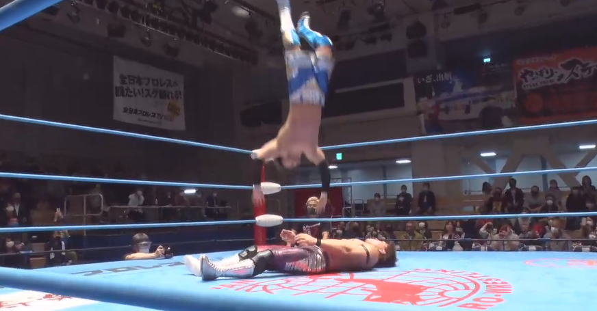 が、その後に飛び出したのが岩本煌史がたまに見せる技で私のお気に入りでもある裏投げで大ダメージを与え、もうこれで終わりかと思いきや青柳亮生がリバースフランケンシュタイナー→フィッシャーマン3連発、そしてムーンサルトプレスで大逆襲。