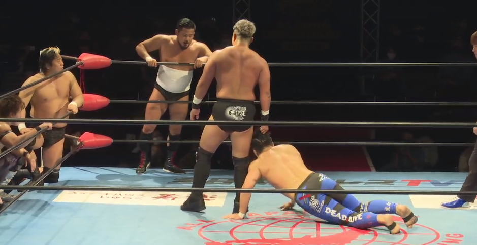 試合終盤、ジェイク・リーは芦野を捕まえると「もう1度チャンスをやる!やれ岩本!」と芦野を制裁することでTOTAL ECLIPSEに入るように呼びかけました。