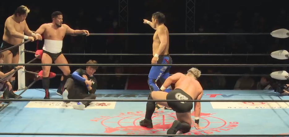 佐藤光留はわざとレフェリーを投げつけて挑発するなどイリミネーションマッチ中に半分仲間割れ状態に。