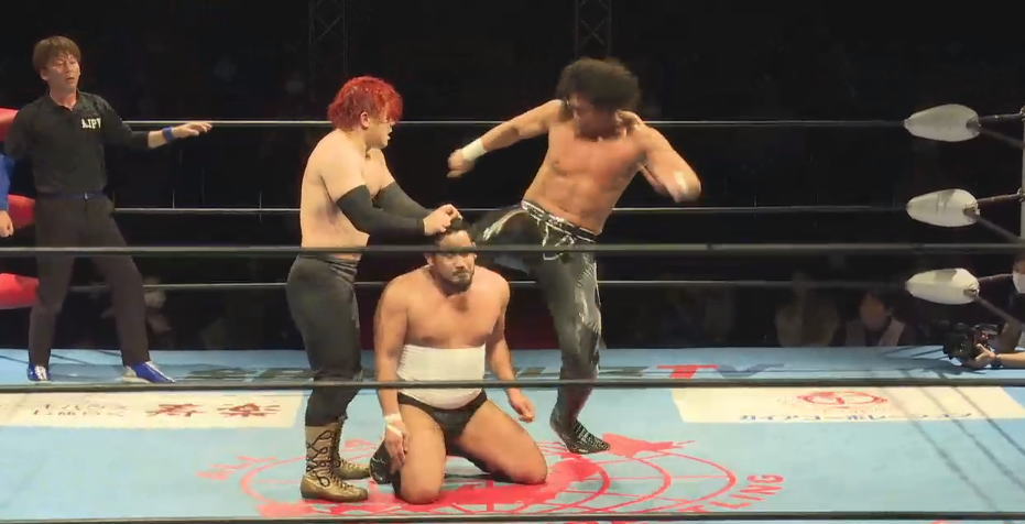 また、この試合はもちろん芦野はアンファン元メンバーへの怒り、そして岩本煌史はジェイクへの怒りとTAJIRIへの苛立ちも抱えての戦いでもありますし、ある意味巻き込まれた形で手を貸している佐藤光留と田村男児、特に佐藤光留はどういう思いなのだろうか?という点が当然気になる構図でした。
