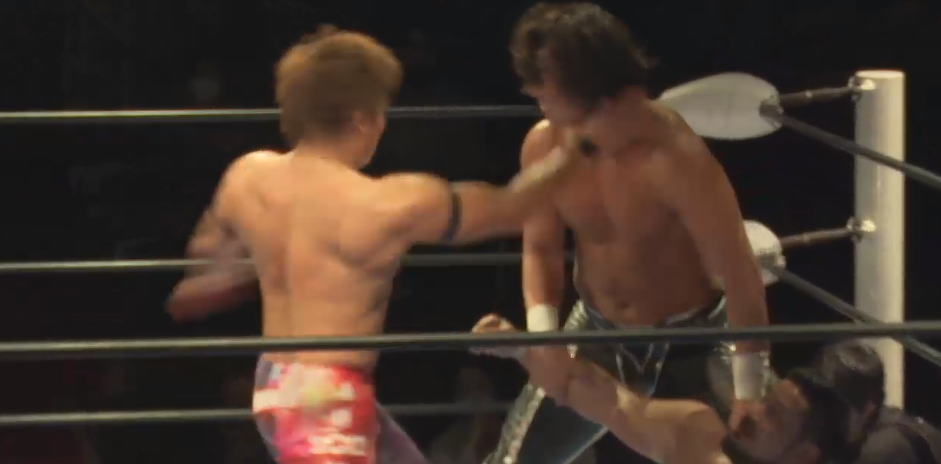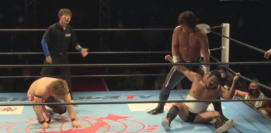 この時点で体力を奪われている岩本が次に取った行動はジェイクへのビンタという答えでしたが、力を振り絞ったこの一発の直後に岩本煌史は場外にぶん投げられて敗北。