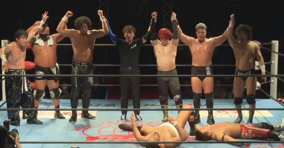 諏訪魔・岩本・芦野・佐藤光留・田村vsジェイク・TAJIRI・大森北斗・土肥こうじ・児玉裕輔(セコンドに羆嵐)という試合は入場時から「よく見るイリミネーションマッチの雰囲気」とは違いました。