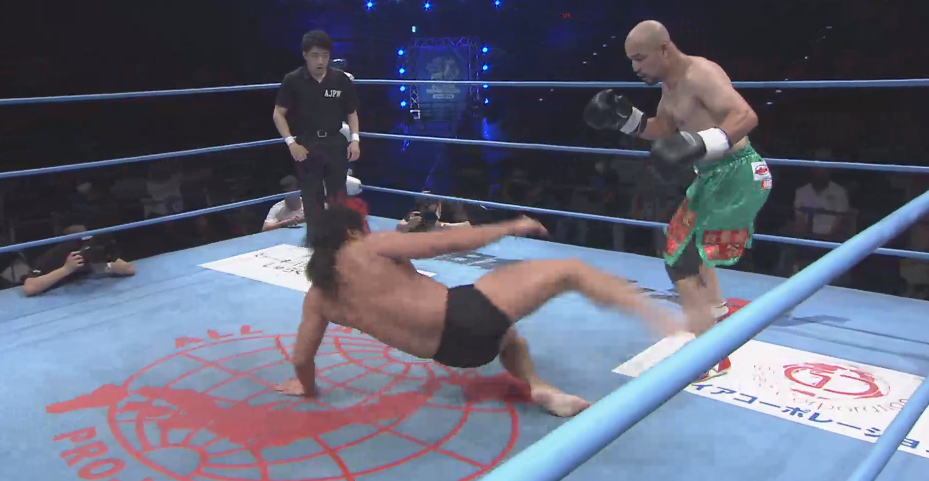 王道ストロングスタイルという危険な言葉を背にしたヨシタツがなんとアリキックを披露。